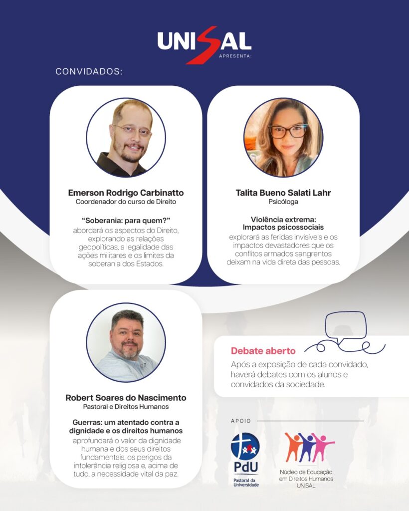 O Centro Universitário Salesiano de São Paulo (UNISAL) convida toda a comunidade acadêmica e o público externo para uma reflexão sobre os atuais conflitos no Irã e no cenário internacional, guiada pelo tema central: “A guerra é sempre injusta. Justa é apenas a paz!”. Estruturado no formato de mesa-redonda, o evento acontecerá na quinta-feira, 05 de março, das 19h às 20h30, no Auditório Vermelho. Com uma abordagem integrada, o encontro busca estimular o debate crítico e humanitário, ajudando nossos estudantes e docentes a compreenderem as complexidades da guerra sob perspectivas convergentes.